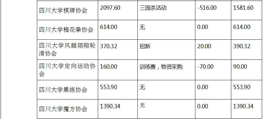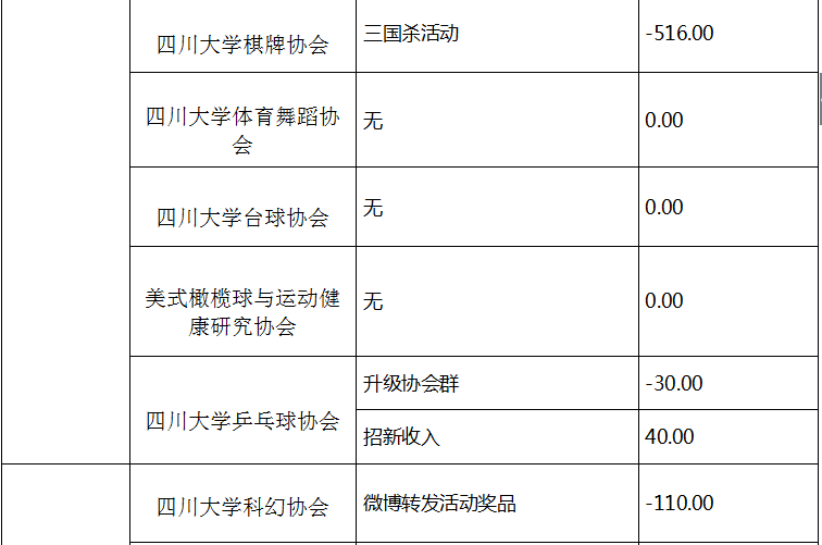 为了使我校社团财务公开透明化,秉承公平公正公开原则,四川大学学生社团联合会(下简称“校社团联”)决定于2016年4月起每月对全校范围内的注册校级社团的财务状况进行财务公示,欢迎老师同学们监督查证,有任何疑问欢迎随时联系相关社团负责人及校社团联财务部的同学。
